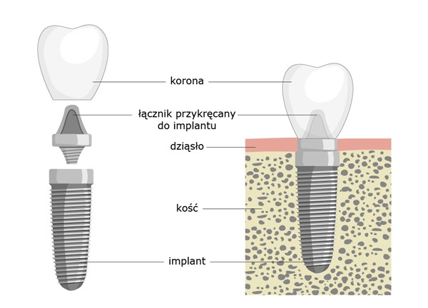 Wbrew pozorom implant to nie jeden element, ale cała konstrukcja. W skład kompletnego uzupełnienia wchodzą: